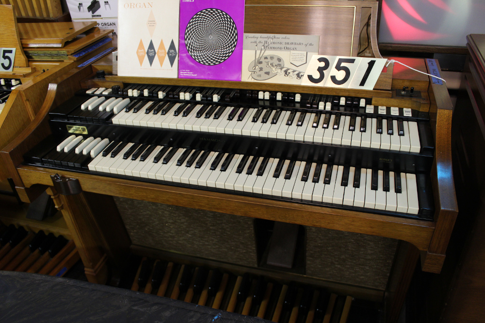 #351 is a walnut Hammond A-100 in close to mint condition! This organ is paired with a Leslie 145/147 that has a finished back. Serial #15240.